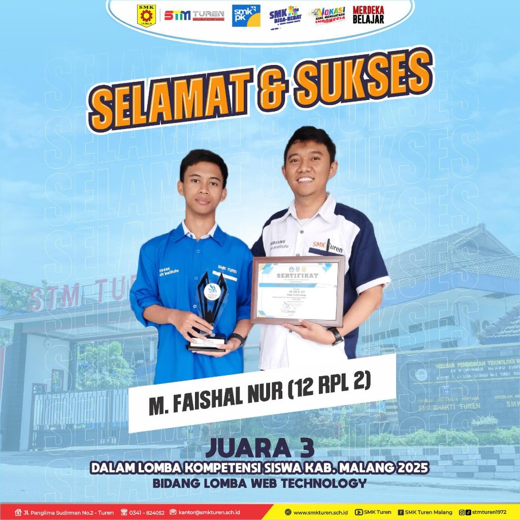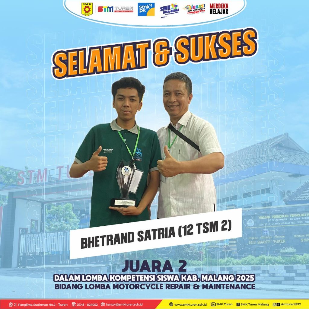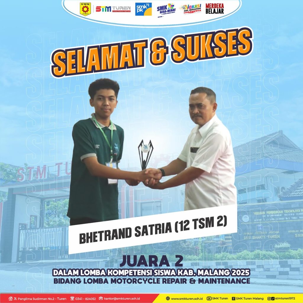 Selamat untuk M. Faishal Nur dari Kelas 12 RPL 2 meraih Juara 3 Dalam Lomba Kompetensi Siswa SMK Tingkat Kab. Malang Tahun 2025 dalam Bidang Lomba Web Technology. Dan Selamat untuk Bhetrand Satria dari Kelas 12 TSM 2 meraih Juara 2 Dalam Lomba Kompetensi Siswa SMK Tingkat Kab. Malang Tahun 2025 dalam Bidang Lomba Motorcycle Repair & Maintenance.