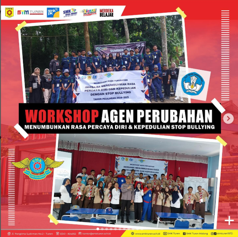 Kegiatan Workshop Agen Perubahan SMK Turen Tahun Ajaran 2024-2025, Kegiatan ini berlangsung selama 2 hari, hari pertama di isi pemateri dan pembekalan oleh Bapak Kapolsek Turen dan dilanjutkan Pembekalan dari Bapak Ibu Tim BK SMK Turen.Dilanjutkan Hari Kedua dengan Outbond…
